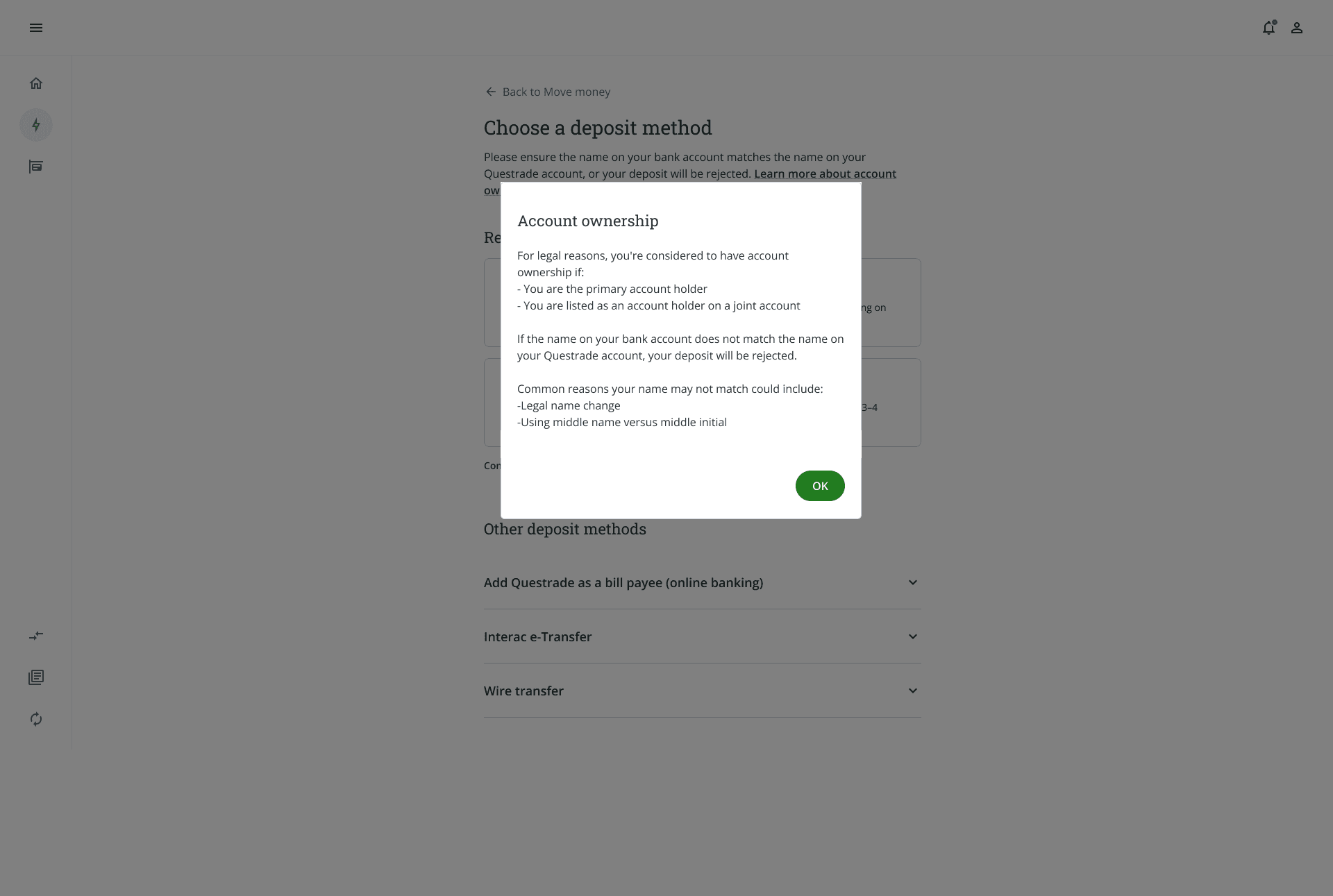 One of the most common reasons deposits were rejected was due to names not matching between the bank account and the Questrade account. To address this, I added an informational modal on the "Choose a deposit method" page which provided more information on what qualifies as account ownership and common reasons for names not matching.